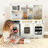 • Wooden Large Play Kitchen: Kids kitchen playset includes sink, oven, stove, coffee maker, ice maker and microwave, and cooking utensils as pot, pan. Rotatable buttons, click sounds and lights simulate real cooking, can meet the children's play needs